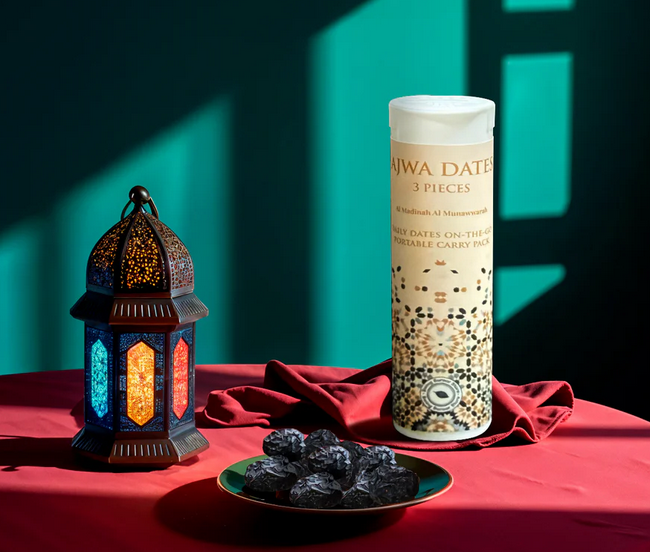 Daily Dates On-the-Go! Our new portable carry pack fits exactly 3 dates- perfect for your daily energy boost and Sunnah practice. Compact, sleek, and easy to use with a pop-top lid, its convenience redefined!
