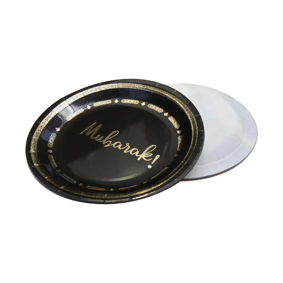 A generic plates set with the words 'Mubarak'. Perfect for a range of Islamic occasions from welcoming pilgrims from Umrah and hajj to eid parties and celebrations