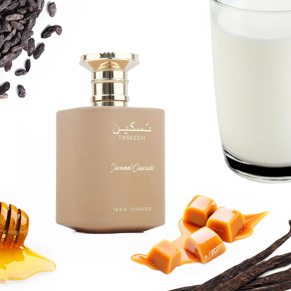 Taskeen Caramel Cascade opens with sweet, seductive notes of luscious Caramel paired beautifully with creamy Milk that elevates the sophistication of the caramel fragrance. The heart notes come with the caramel-like oriental note of Tonka bean. It is blended with Honey, imparting a balancing warmth with its amber-y sweetness.